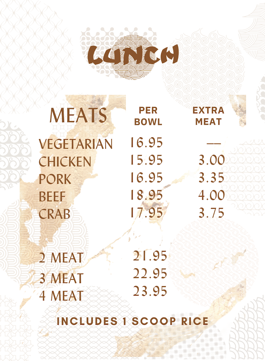 Lunch starting at $15.95. Other meats available: pork, beef, crab. Includes 1 scoop of steamed rice.