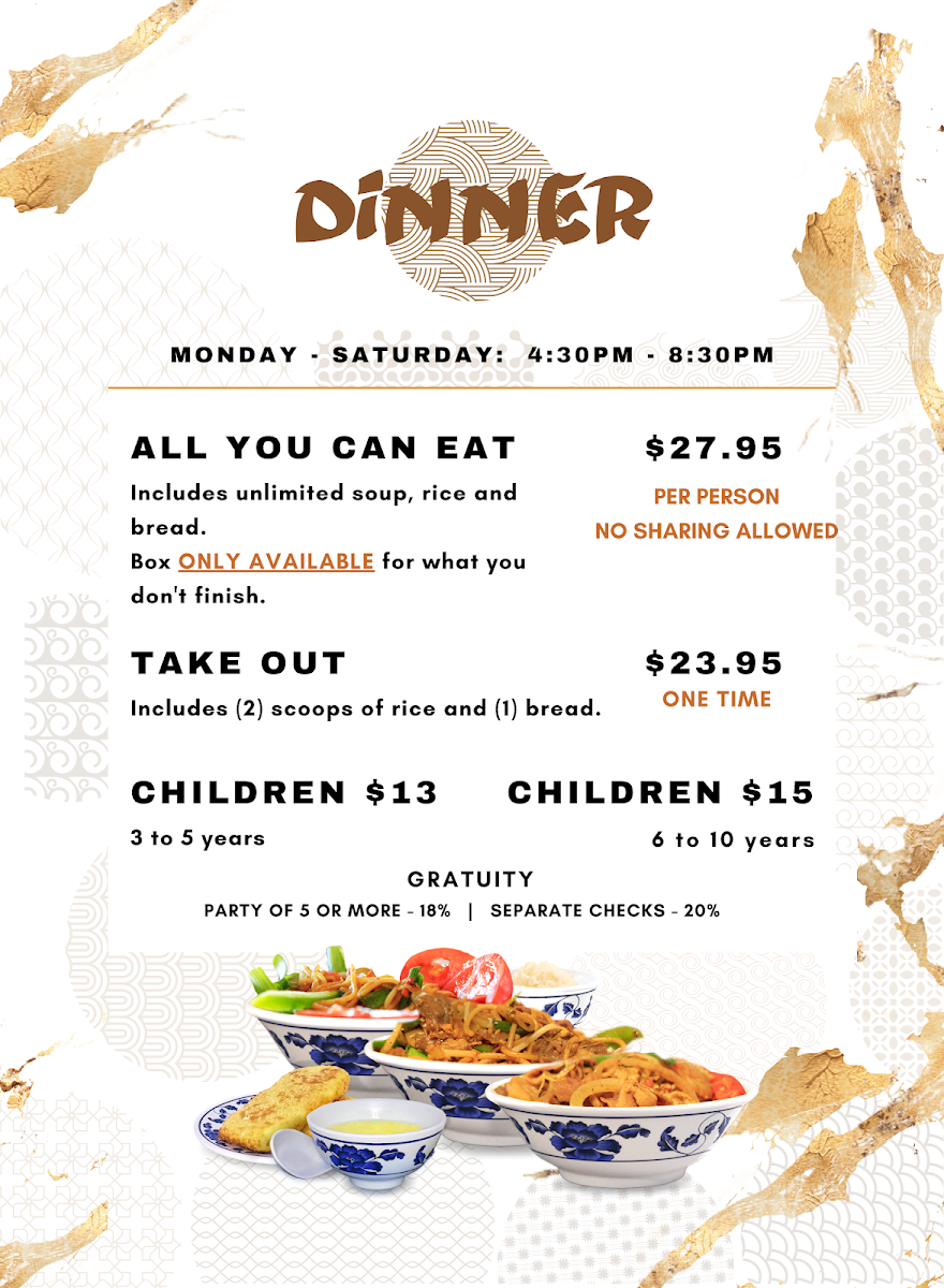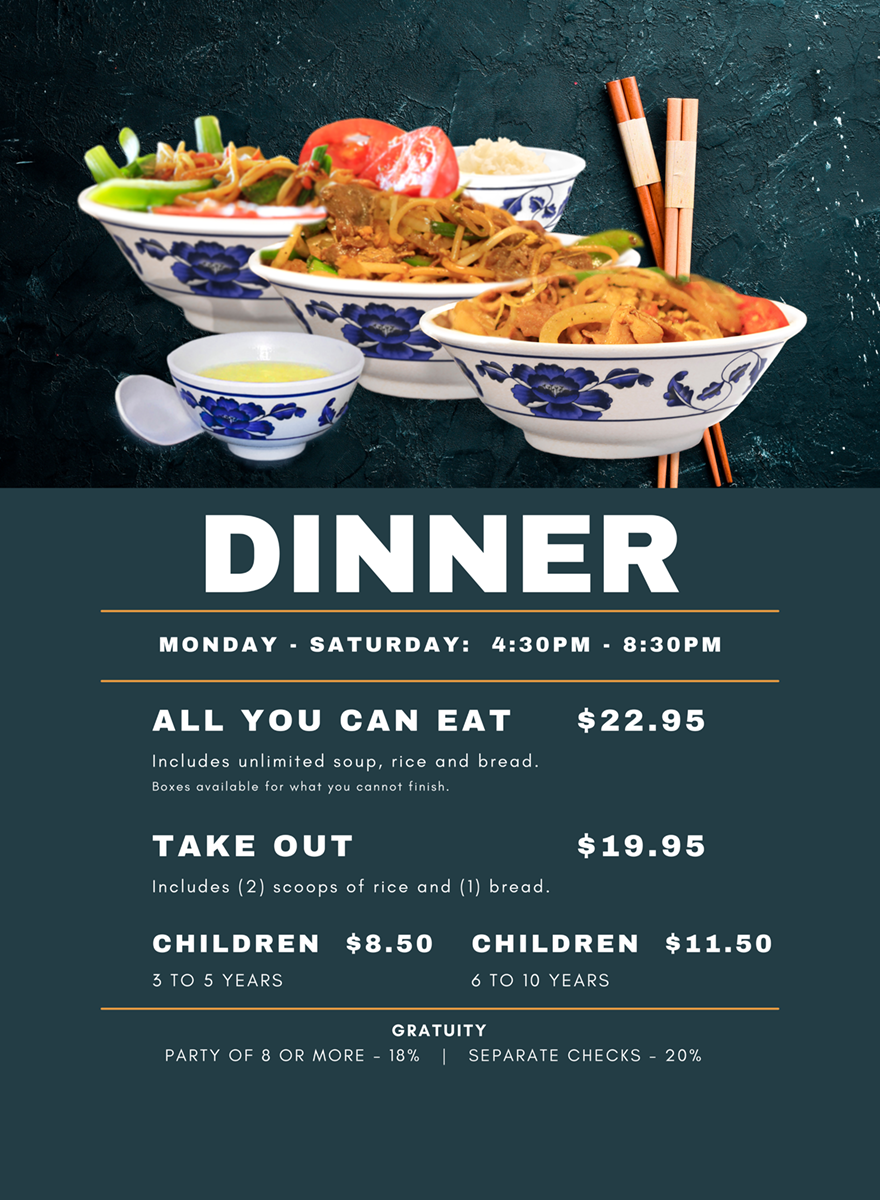 Includes unlimited soup, rice and bread. Boxes available for what you cannot finish.